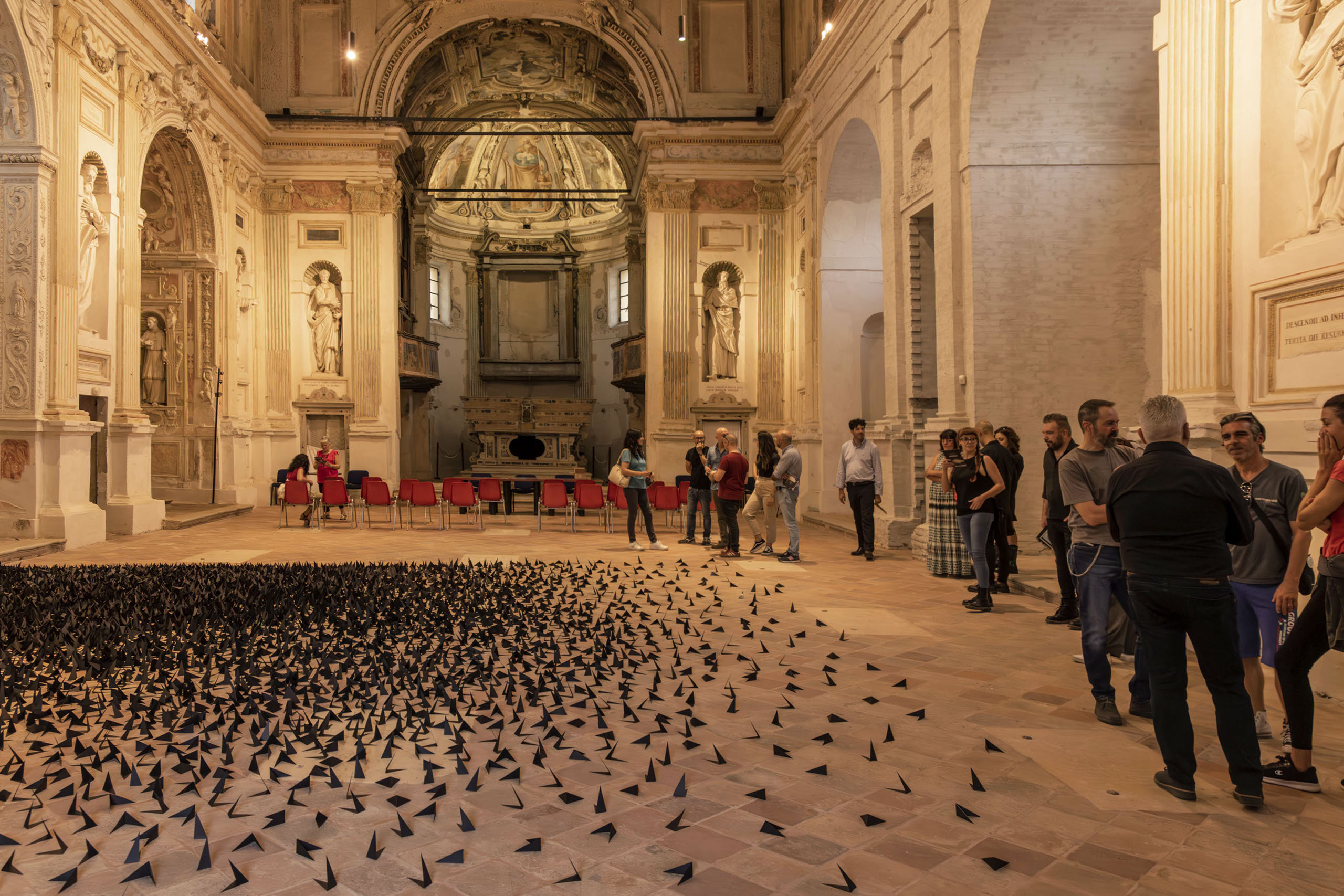 di uno stormo di rondini. Proprio il confronto tra resa esteticamente monocromatica, a suo modo “minimalista”, dell’opera ed apparato decorativo sfarzoso dell’edificio barocco, costituisce un valore aggiunto al progetto; ma se all’apparenza emerge immediatamente questa tensione