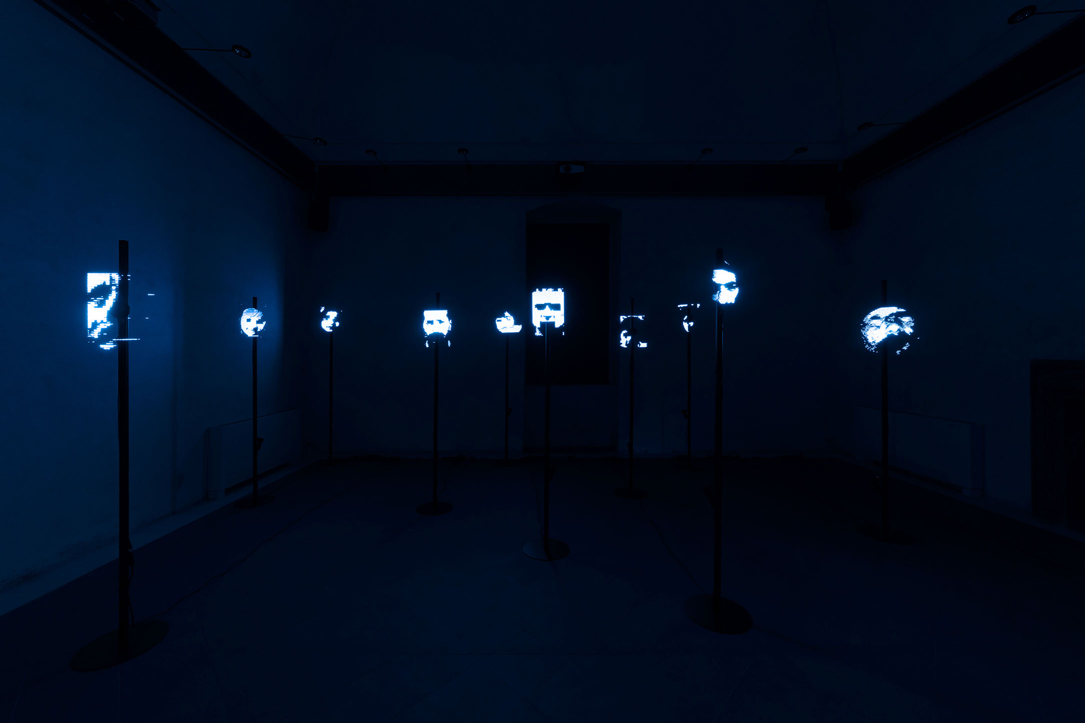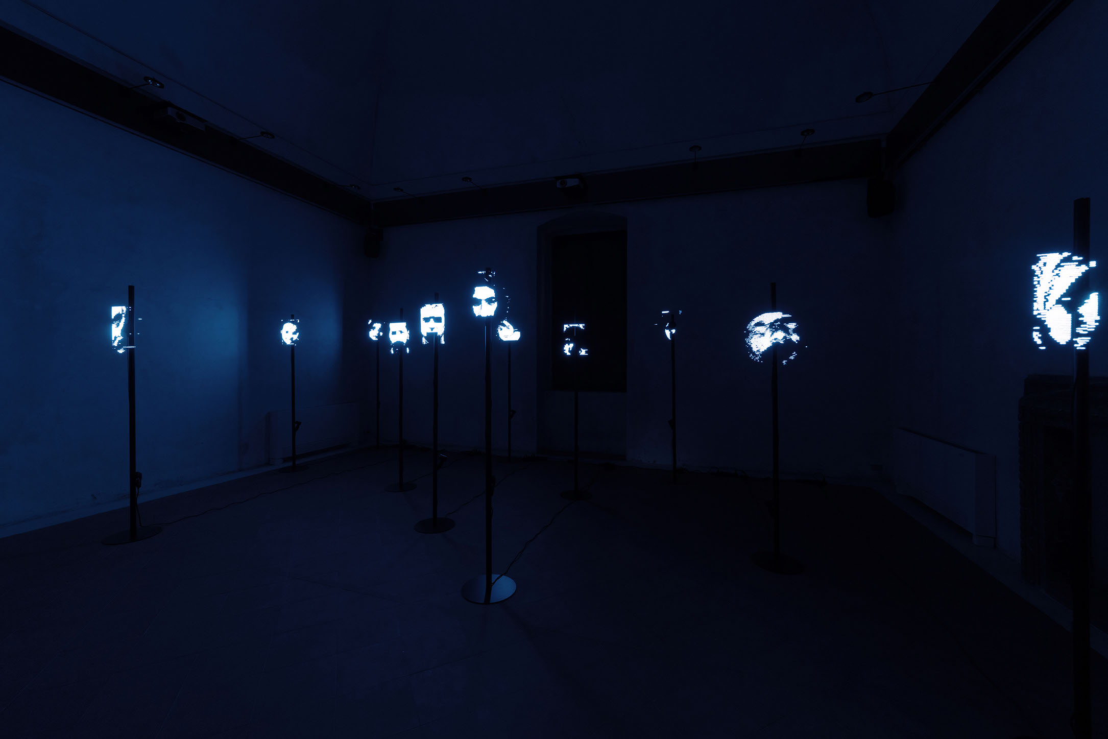 UNDICI TESTE CHE RIEMPIONO IL LUOGO ESPOSITIVO IN UN CONTINUUM TRA LUCE, TEMPO E SPAZIO.